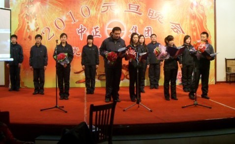 本次年會共分為三部分。第一部分是2009年總結(jié)會,于上午成功召開;第二部分是2009年優(yōu)秀員工頒獎大會,于下午三點隆重舉行,來自集團(tuán)及分公司的十二位優(yōu)秀員工受到表彰;第三部分是2010年元旦晚會,于下午四點開始,在一派喜氣洋洋中,應(yīng)邀嘉賓、集團(tuán)及各分公司領(lǐng)導(dǎo)、集團(tuán)及各分公司員工、員工家屬等共計200余人一起度過了美好而難忘的快樂時光。